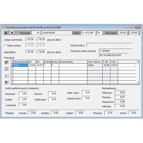 Docházka je komplexní řešení sledování docházky pracovníků ve firmách. Je určeno ke vstupním jednotkám BF-XXX. Program sleduje průchody (docházky) terminálem a výsledkem je vyhodnocení docházky pracovníků jako podklad pro zpracování mezd, dále umožňuje zavádět uživatele programu a nastavovat jim práva přístupu podle potřeby. Je možné nastavit pracovníkům pouze přístup k vlastní docházce a tím pracovníkům umožnit kontrolu vlastní docházky bez možnosti změny. Verze nad 25 zaměstnanců. Demo ke stažení zde.